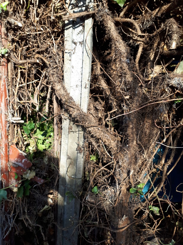 It took months of hard work to get rid of it, by which time it had already started moving the concrete fence posts.  The ivy still grows in the gardens of my neighbours and tries to encroach in my garden.  I spoke to the lady who lives at the bottom of my garden and she told me I could go ahead and try to kill it – there is a very old shed in the way so she can’t get to it.